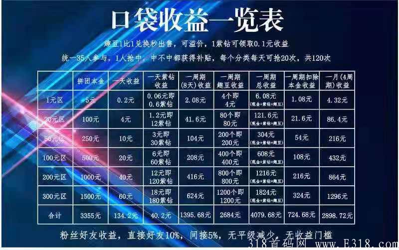 点击趣拼团开始拼团,最低1元,最高300元。一共有35/1的概率中奖,每天每个区间20次机会,每次可以获得1%的奖金,比如说100元每天**就是20个1元收益就是20元时候一样,其他区间同理。