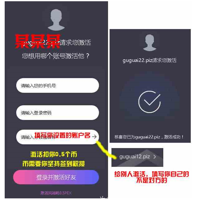 邀请人注册好后,他也需要激活,他会把激活页面发给你,你输入以下信息给他激活就行了,扣你0.5个币