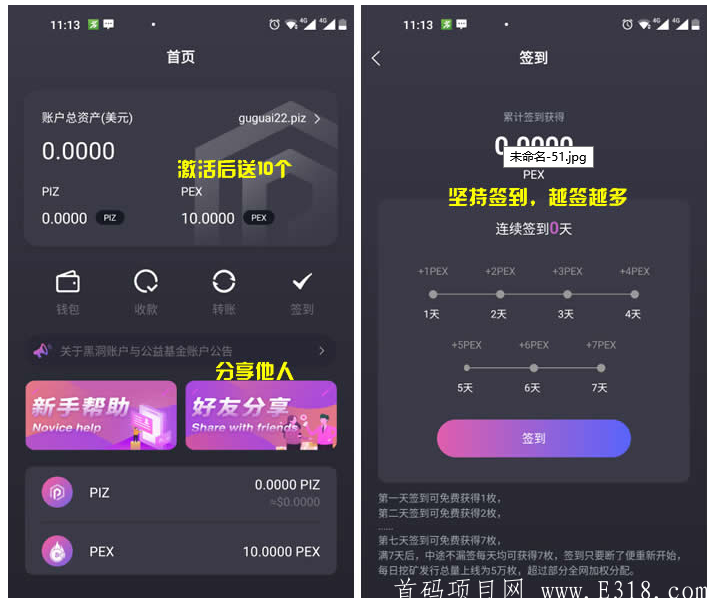 Pizza宝注册送10个PEX每天签到也可以领取,有人说是大毛,不用实名