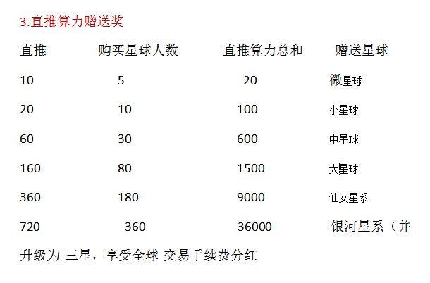3)三星使者,直推30人以上,团队产生二个二星,团队总算 力大于等于6600,享受全球手续费**15%,增送中型星球,(1000 *** -4300 ***)
