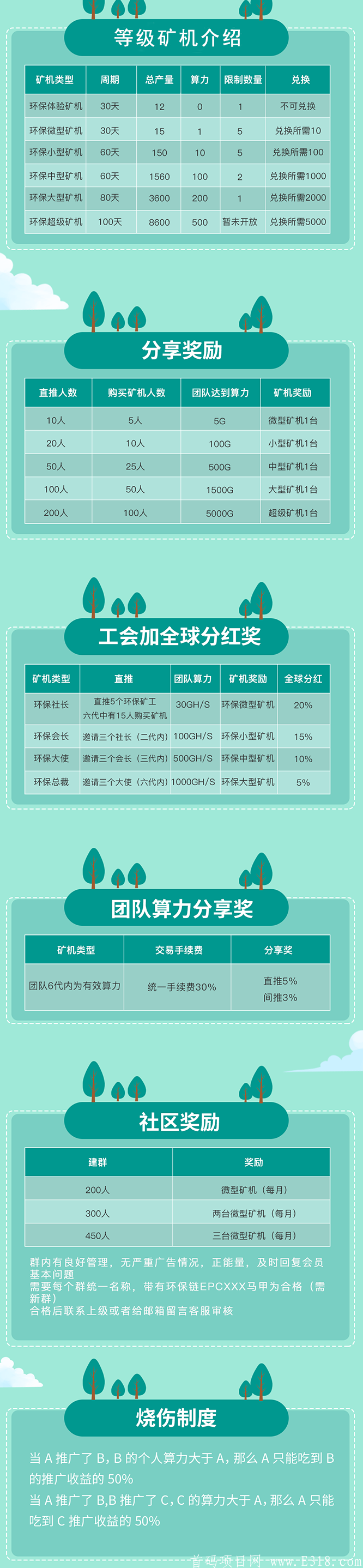 注册并通过实名认证赠送一台体验矿机,每日登录签到,以及领取矿机收益(48小时之内领取亦可),赠送的矿机每日产0.4EPC,周期30天总产12EPC,邀请补,烧伤制,等级制度,团队化推广!
