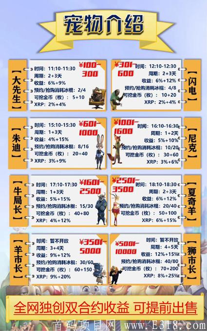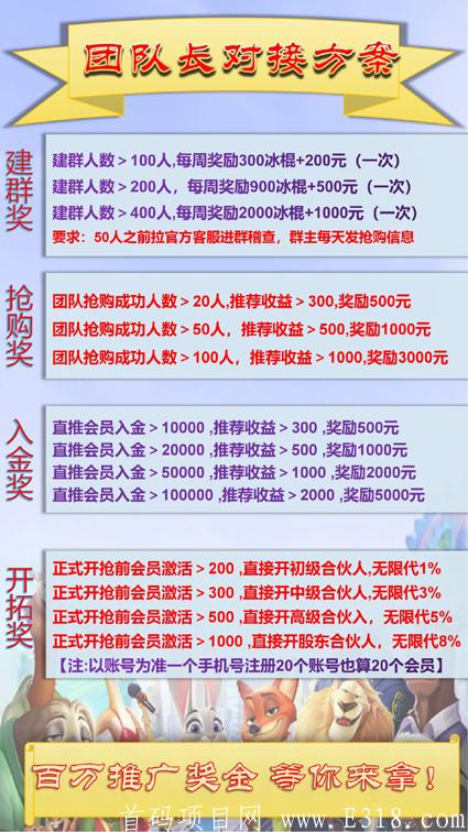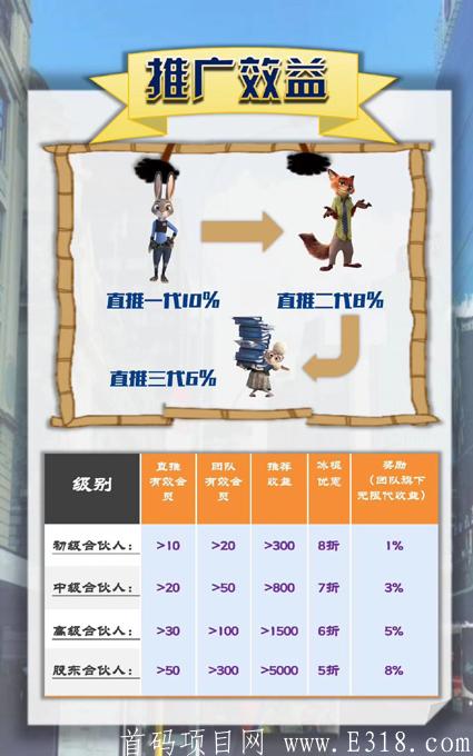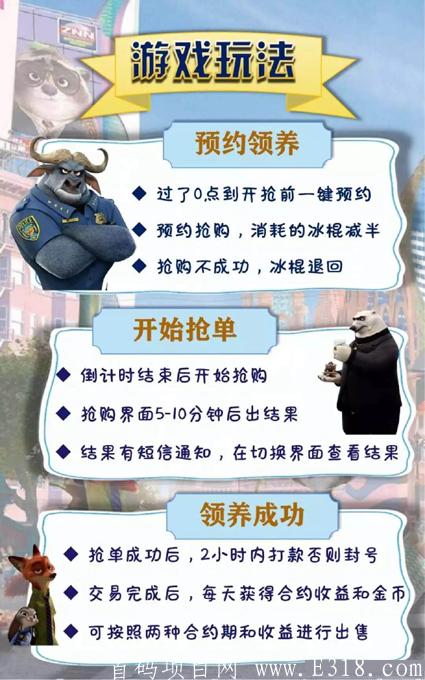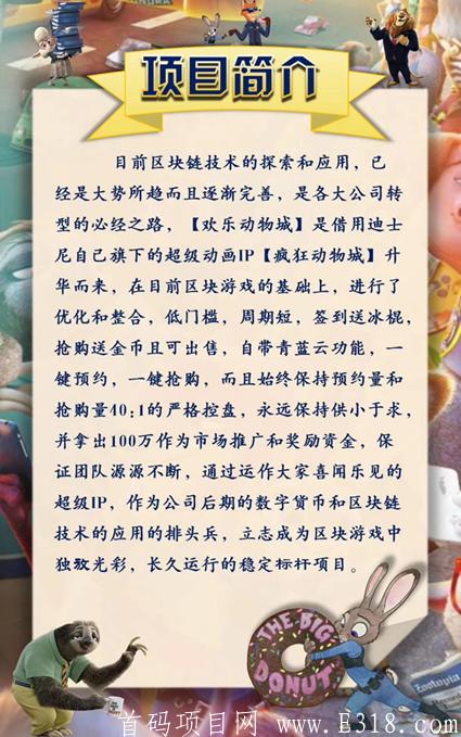 欢乐动物城是借用迪士尼旗下超级动画IP【疯狂动物城】升华而来,在区块链游戏的基础上进行优化和整合。低门槛短周期,签到送冰棍、抢购送金币且可出售。一键预约,一键抢购,严格控盘,永远保持供小于求,并拿出100万作为市场推广奖励,保证团队源源不断。
