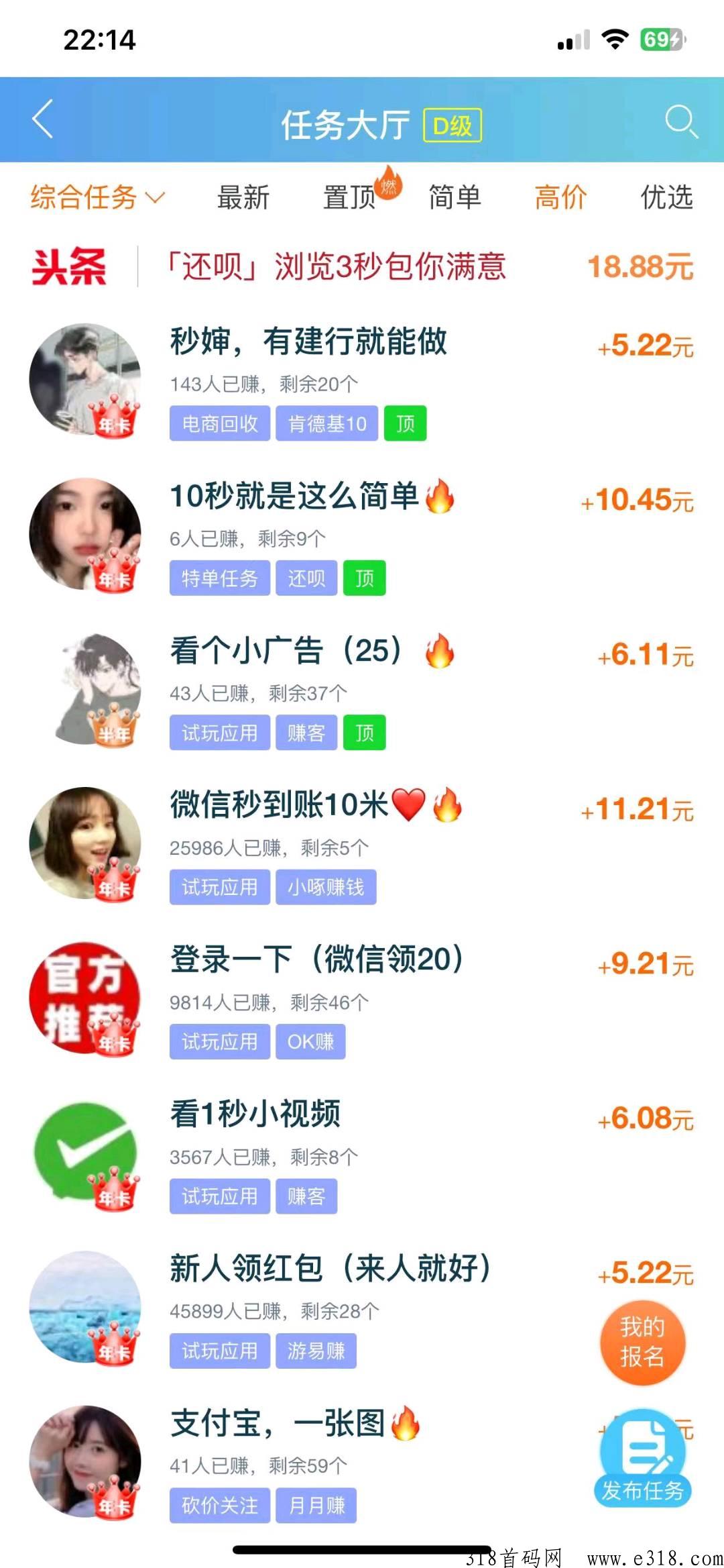 超多任务供你选择 有几毛到几百不等 难易程度也不等 平时闲暇时间做做简单小任务赚点零花钱