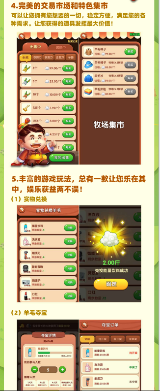 在快乐剪羊毛中,每一只羊都会给您带来不同的惊喜。这种独特的设定增加了游戏的趣味性,让您不知道下一只羊会带来什么惊喜收益。同时,这款APP还拥有完善的买卖市场,提供特色集市功能,让您能够更灵活地交易和获取收益。
