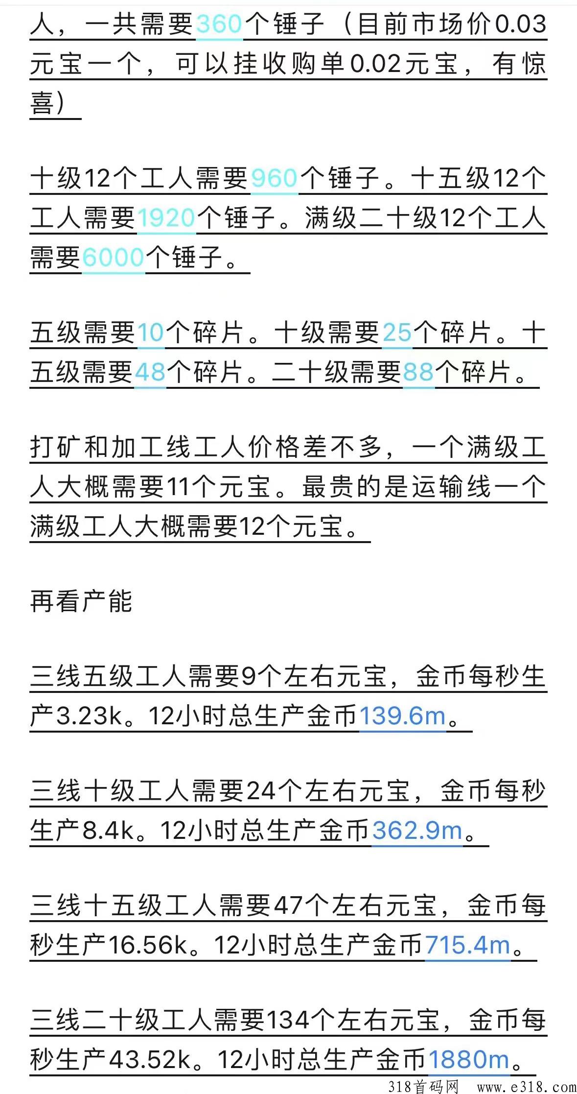 (可选较为推荐)将所有工人都升到10级(使用600锤子+180碎片), 花费20.4元宝,产量362.88m/12小时