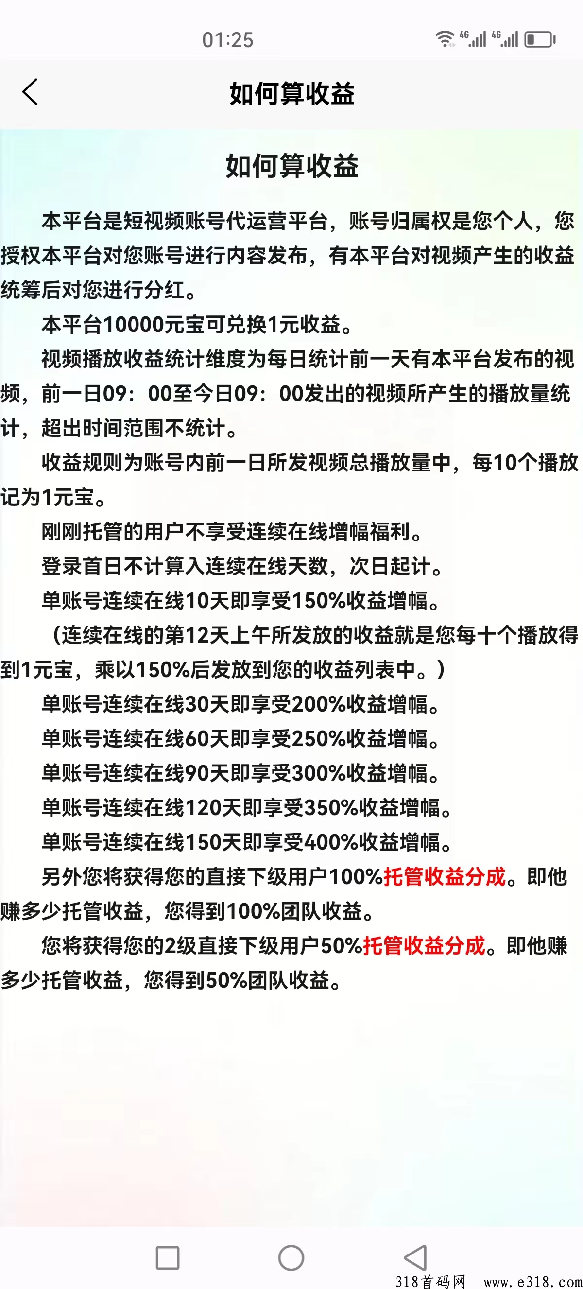 3、一咅阝分账号刚开始收益不稳定的时候不要着急,随着视频增加,积累粉丝,收益会逐渐增加,托管时间越长,收益会越来越多!