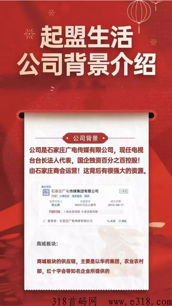 起盟生活由石家庄广电传媒与河北省移动营销企业商会联合发起!100%g企独资控股,1000家企业供应链同步上线!企业法人是现任台长,合规合法,资源强大!