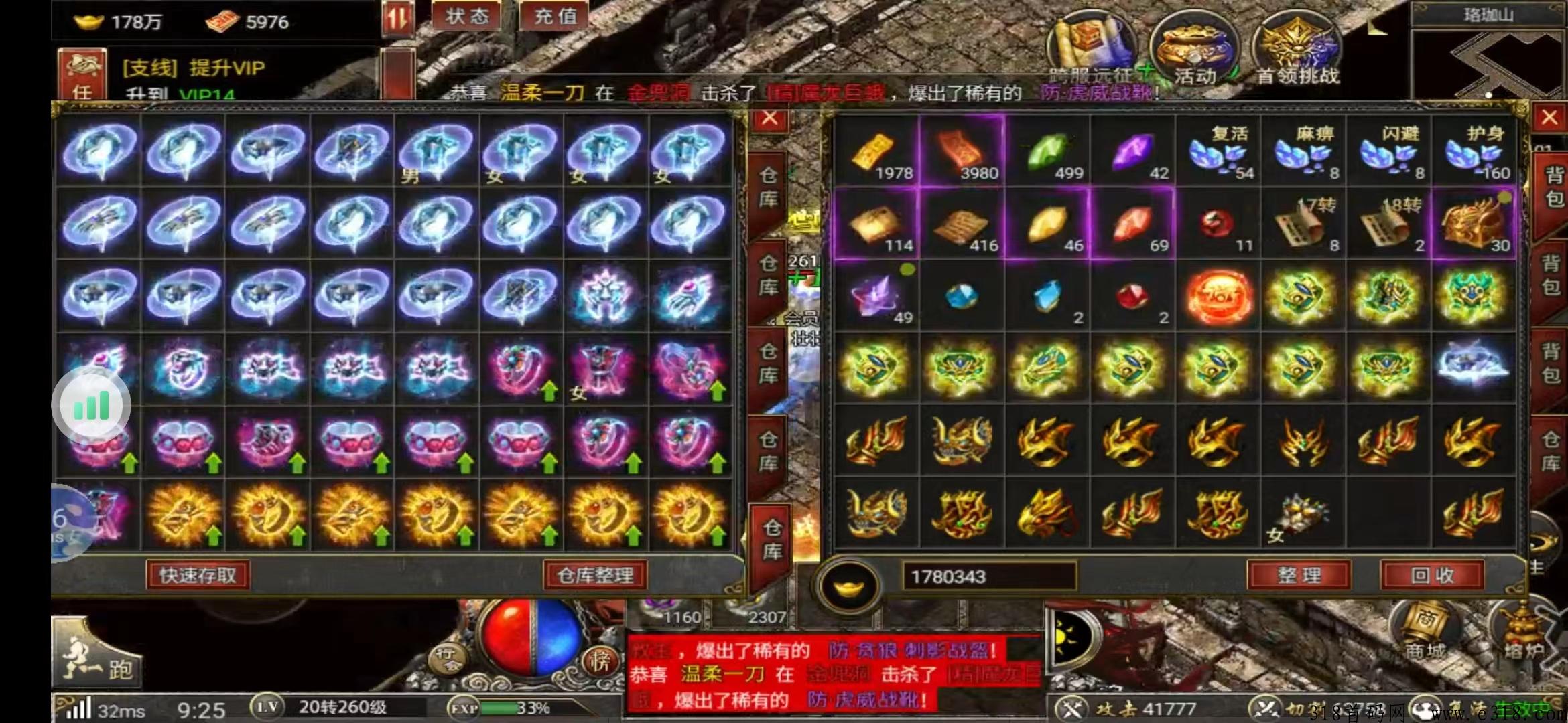 (3)经验:本服所有怪物都会掉落天地精华,使用后可以获得巨量经验。打得越多,获得的天地精华也越多。(土豪玩家可以直接在商城购买,在前期达到满级后可以轻松击败800级的BOSS)