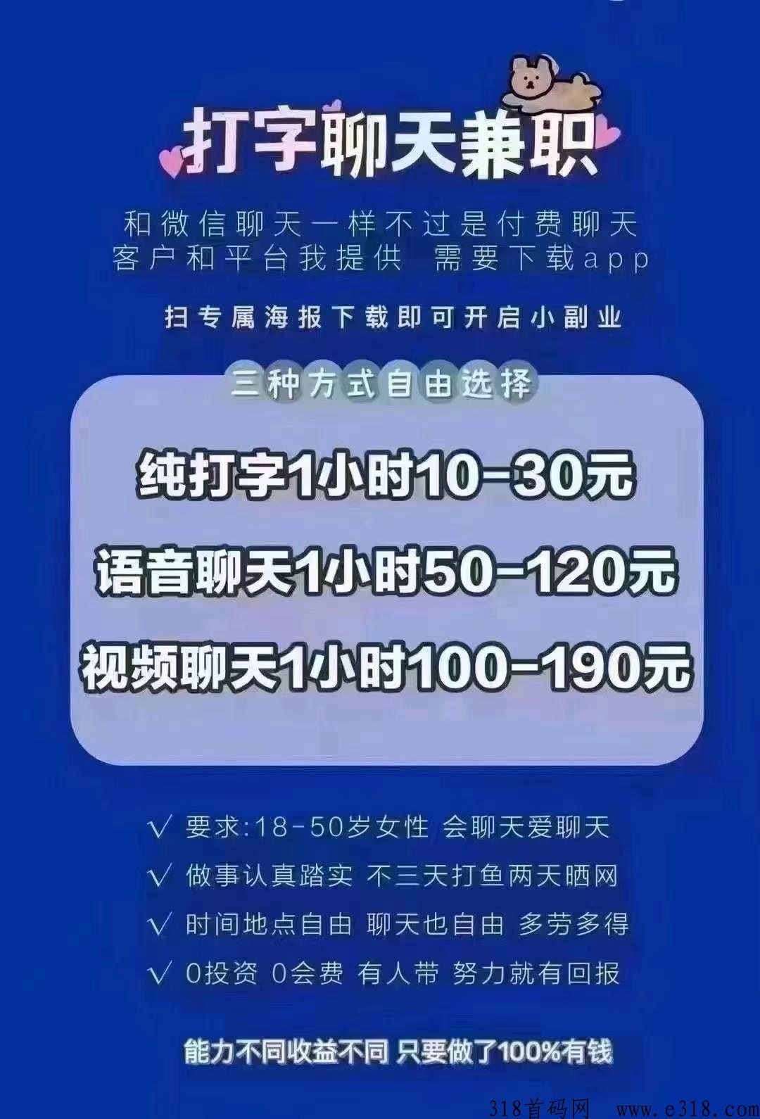 1:聊天员 女 18-55岁 (收益 300-2000)上不封顶