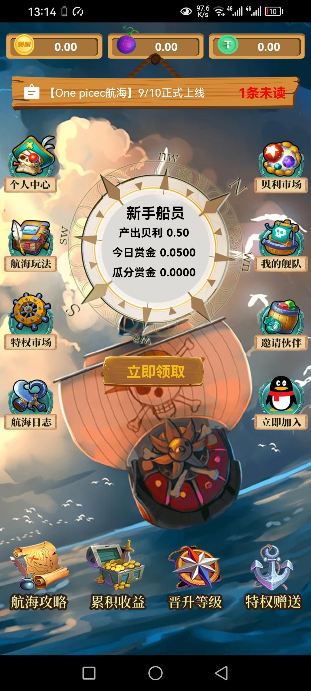 航海世界,每天登录领取收益,升级提高收益,非常基础的玩法,每天领收益就可以了