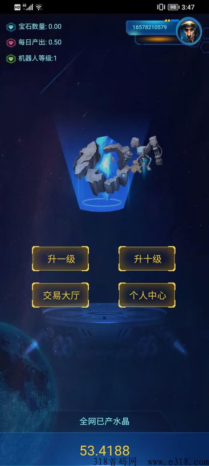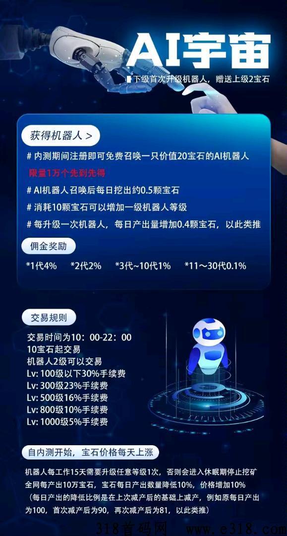 ①注册免费赠送一台价值20宝石AI机器人,AI机器人召唤后每日挖出约0.5颗宝石,消耗10颗钻石可以增加一级机器人等级,每升级一次机器人等级宝石产量增加0.4