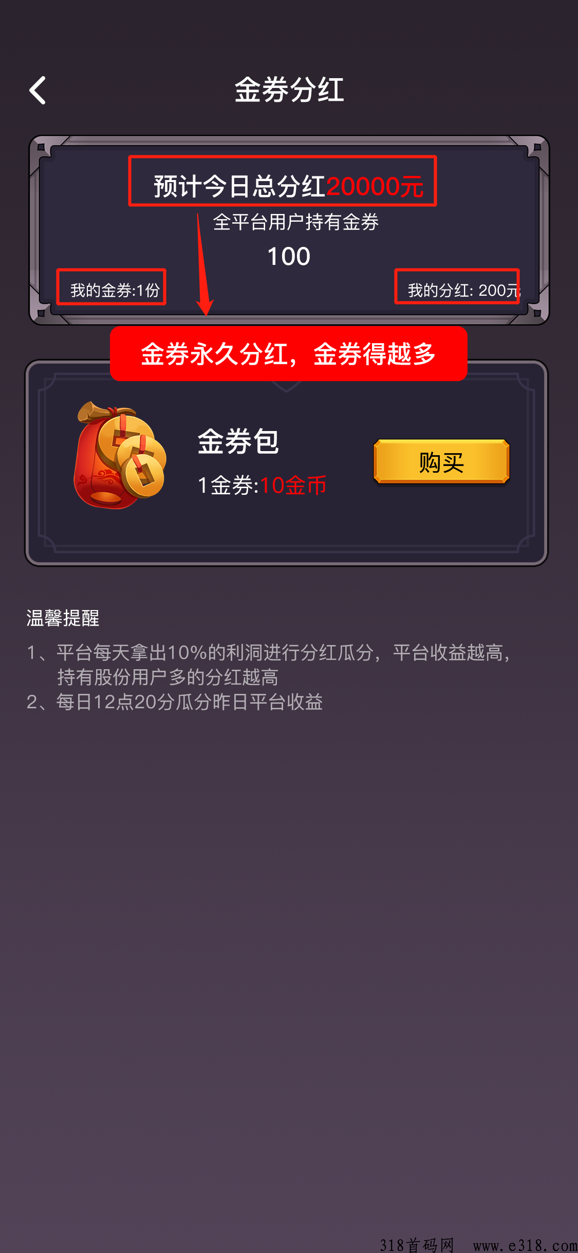 瓜分平台每日收益,金币购买金券,享受每日平台永久分洪。