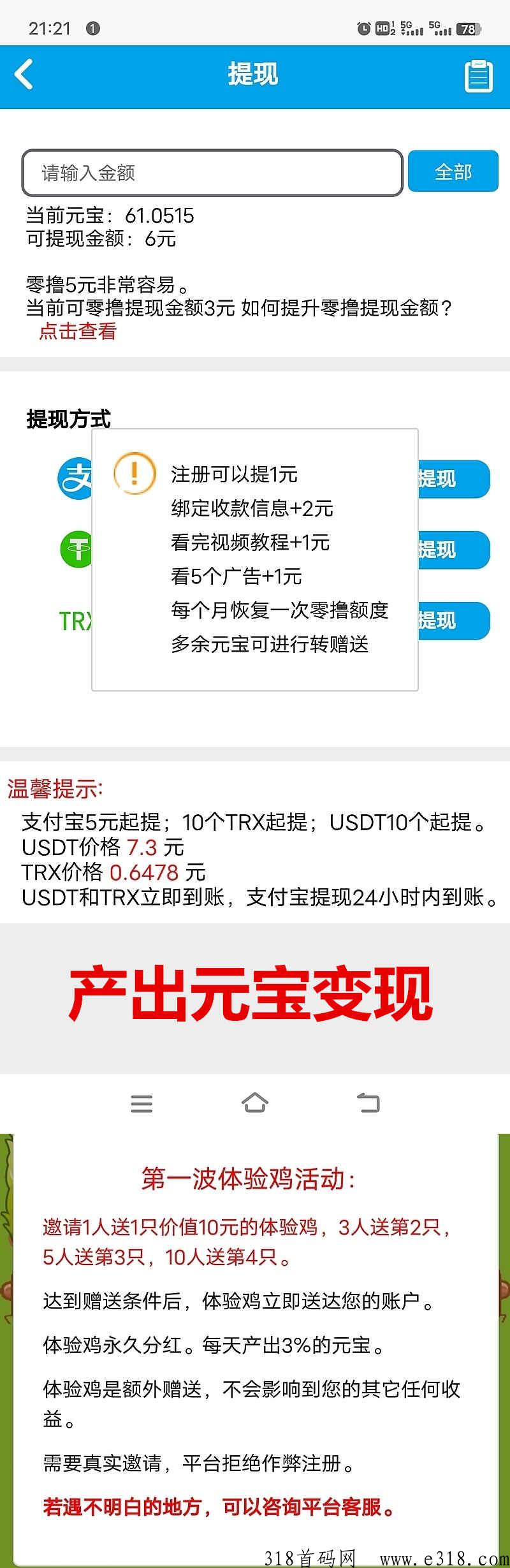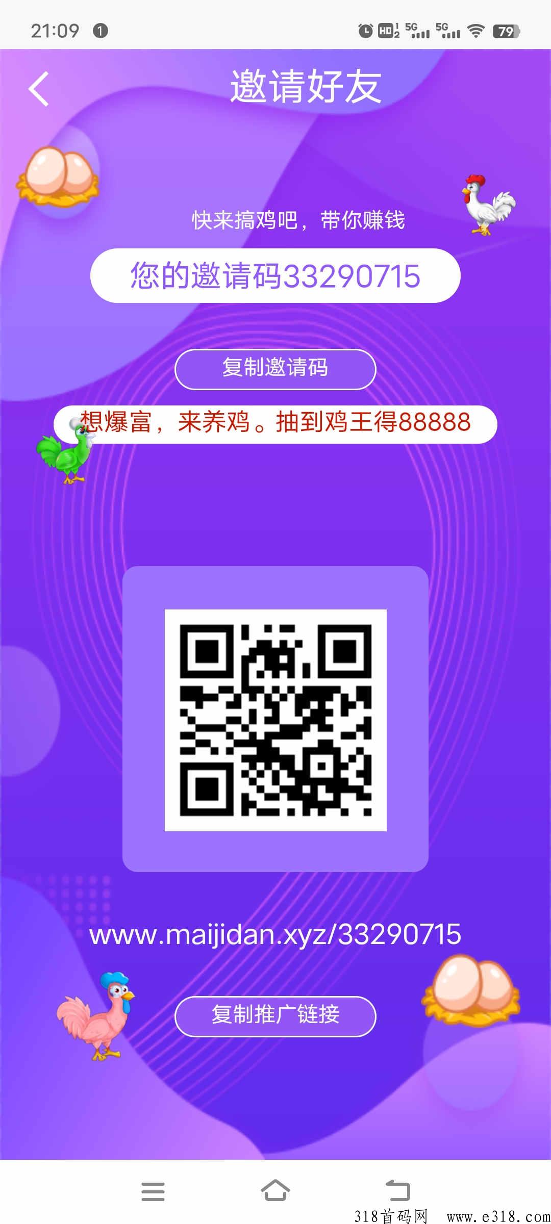 三、邀请好友送体验鸡活动,体验鸡永久分h 每天产出3%元宝