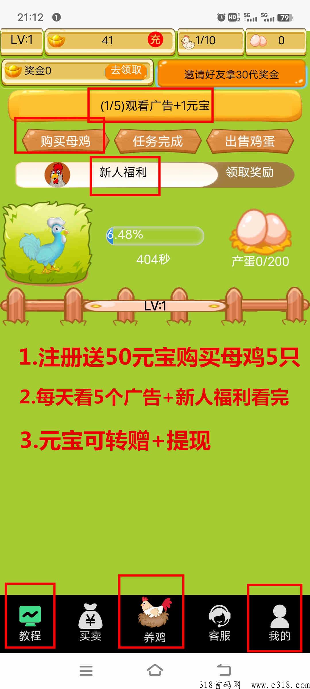 一、免费注册,送50元宝,购买母鸡(新手先1级买5个,每天自动产鸡蛋自动卖出)