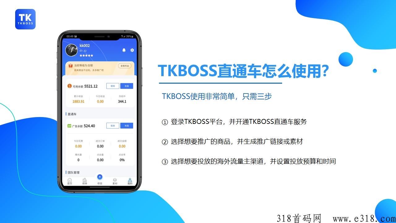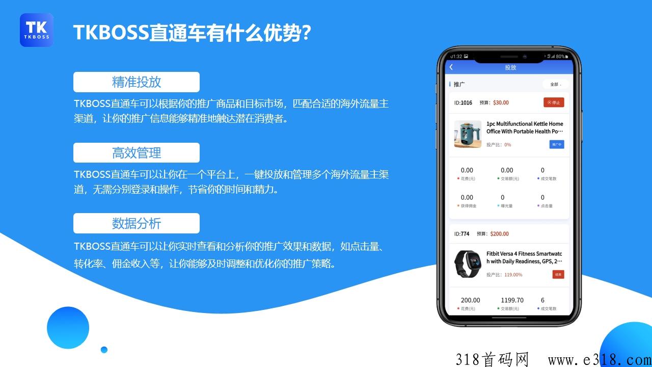 tkboss提供直通车投放广告增值服务,就像投抖音加流量,拼多多的直通车,目前TK BOSS平台与海外数千家社交媒体网站合作拥有大量的广告版位,通过大数据根据用户的搜索精准推送上热门产生订单,不出单就申请赔付!