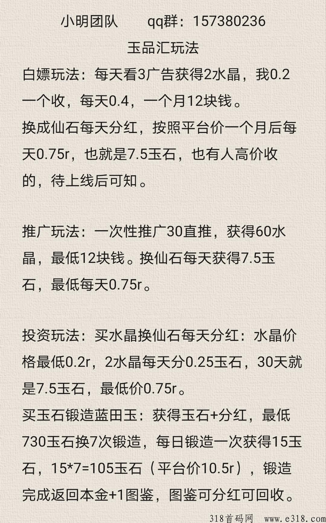 推广玩法:一次性推广30直推,获得60水晶,最低12块钱。换仙石每天获得7.5玉石,最低每天0.75r。