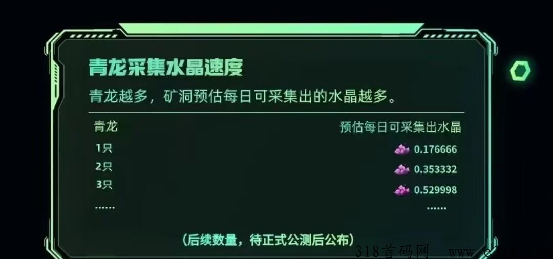 举例:3只青龙(投资60米,扶持15米)月产15.8个水晶X4.5米=71米(半个月即可回本、从此躺赚)