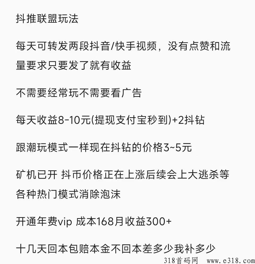 抖推联盟,每天躺赚10+和2抖砖(十几天回本,包赔本金)