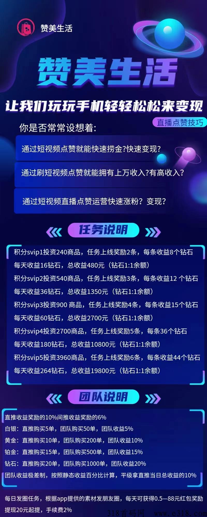 包赚模式需要投入资金抖音快手点赞就可以。购买产品获得积分然后兑换VIP会员。等级越高每天获得的收益越高。等级1点赞一个获得两点五园一个。有很多单。等于最高的一个可以做到十五块钱一个。只需要点赞就可以。努力下来一天可以过去上千的收益。