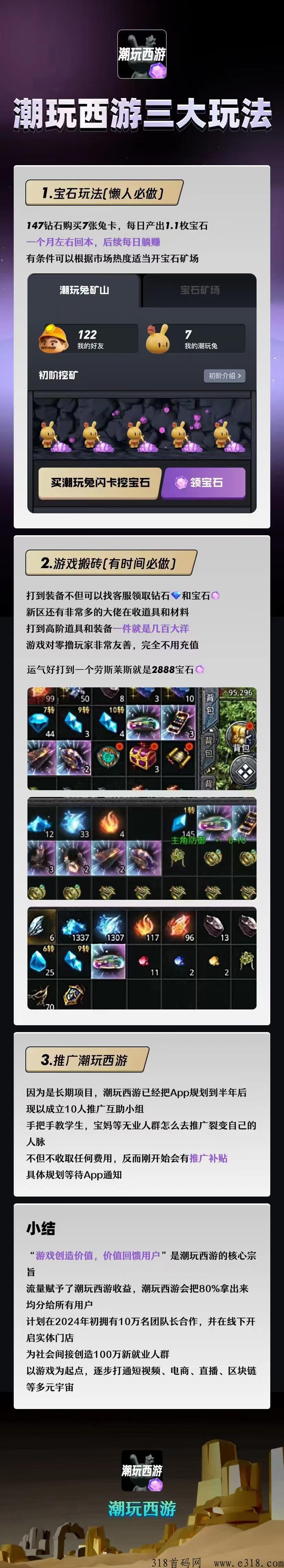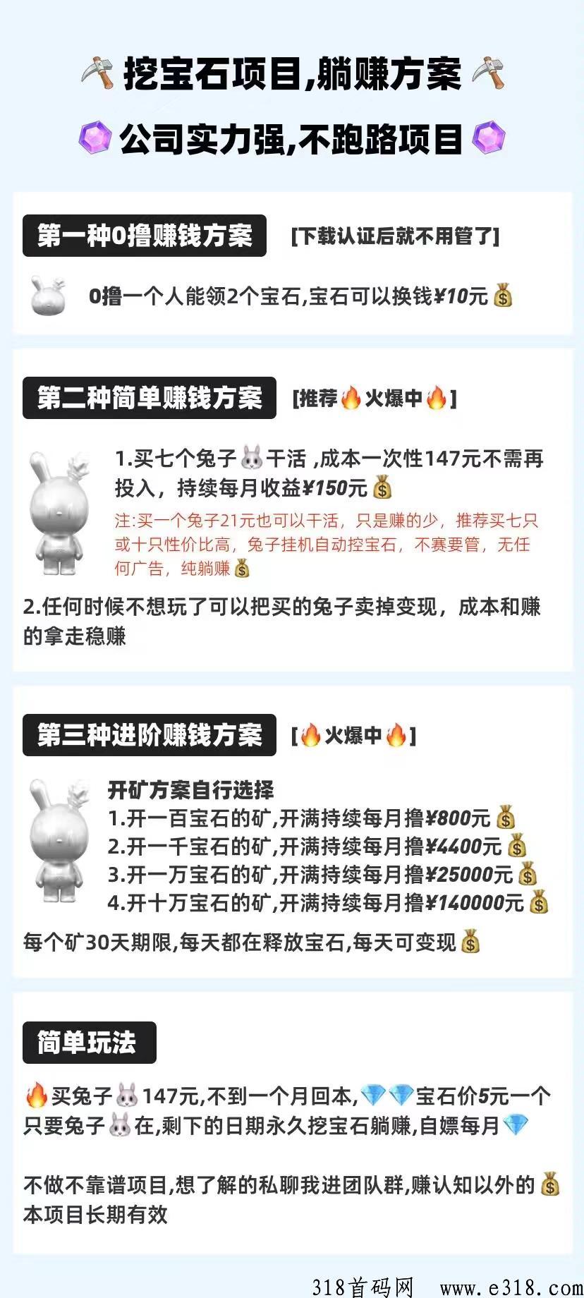 玩法介绍:一人一号,永久挖,147等于7只兔子,每天自动挖1.1宝石。官方兜底5元,不到一个月回本,进群了解