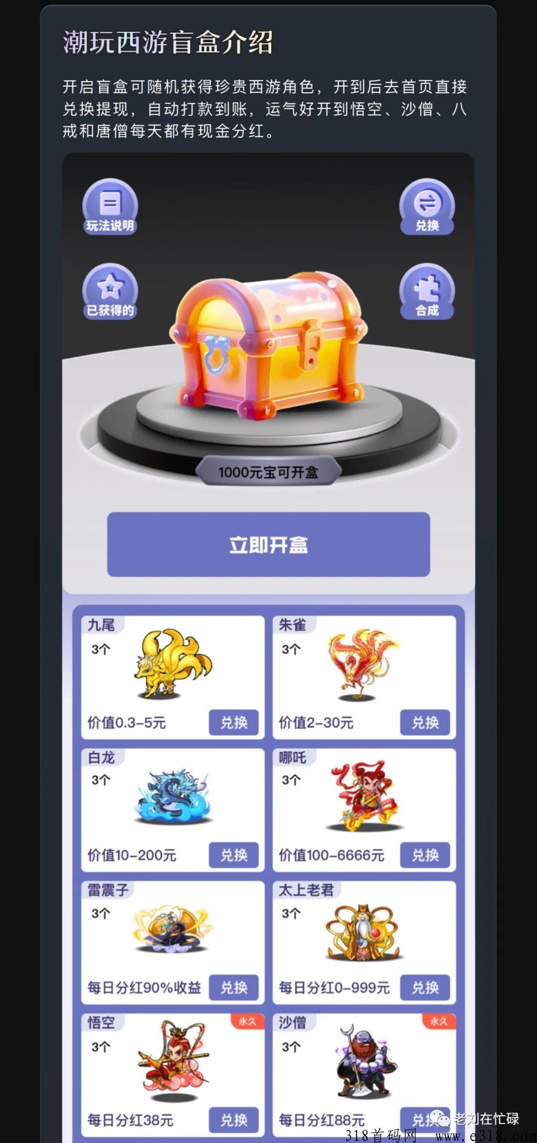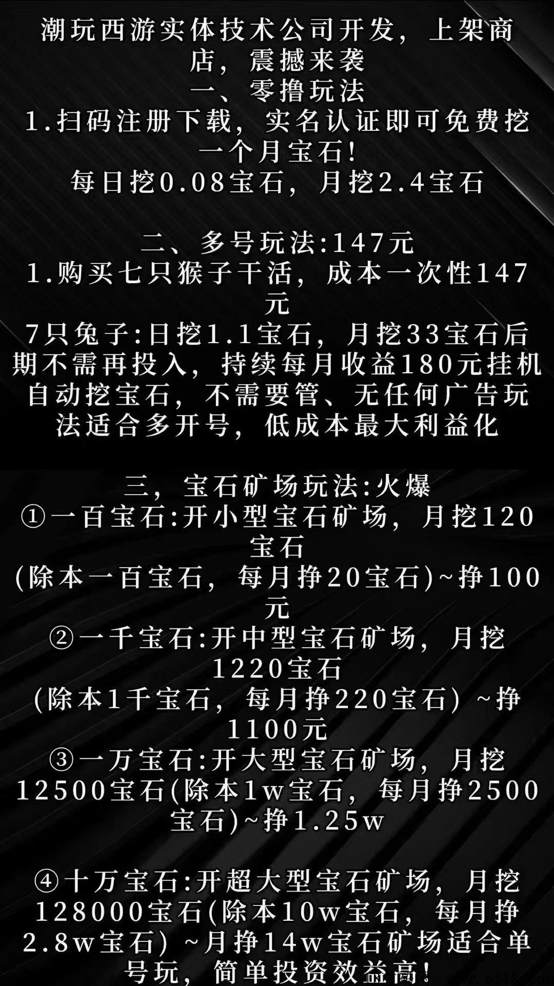潮玩西游10月底首发上线,对标潮玩宇宙!每天会给你自动挖宝石,宝石每天可以随时变现,单号每个月可以变现500-2K,也可以开多号,长久项目,月月躺赚。爆?的潮玩