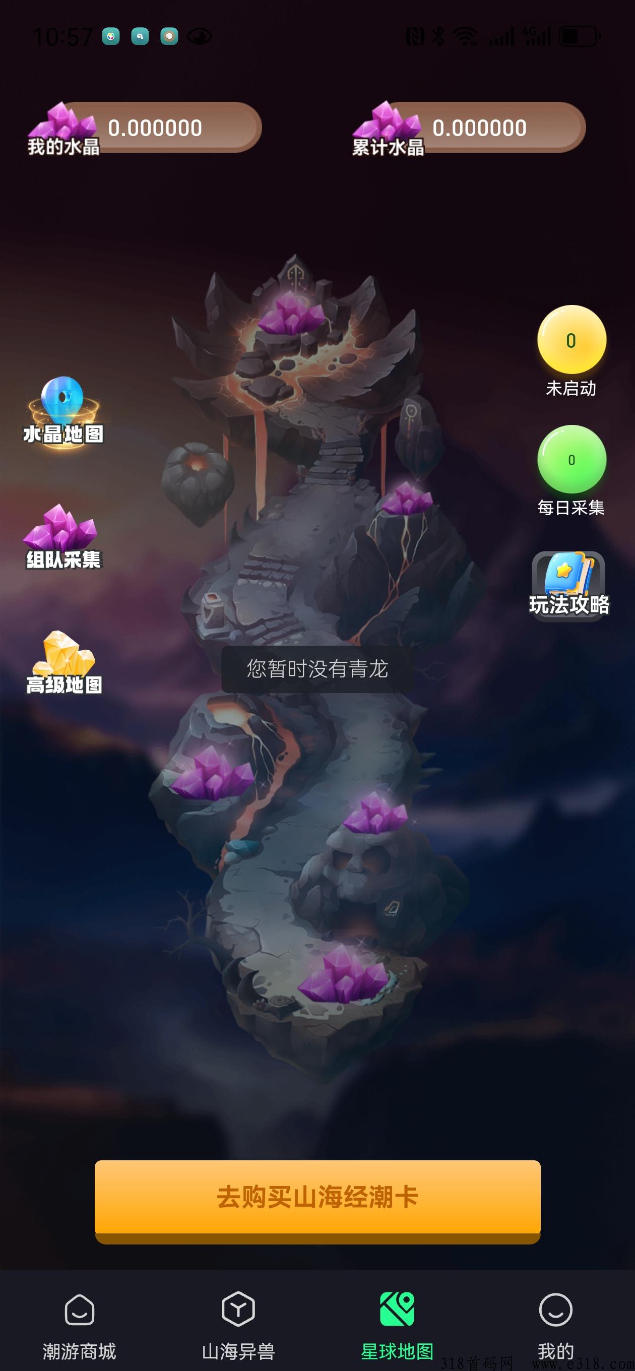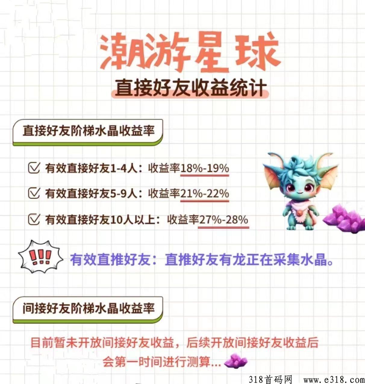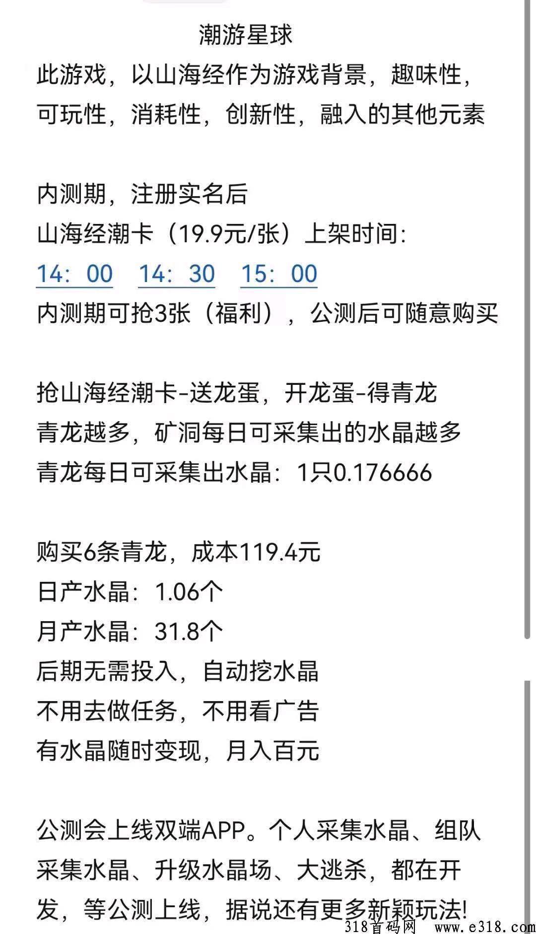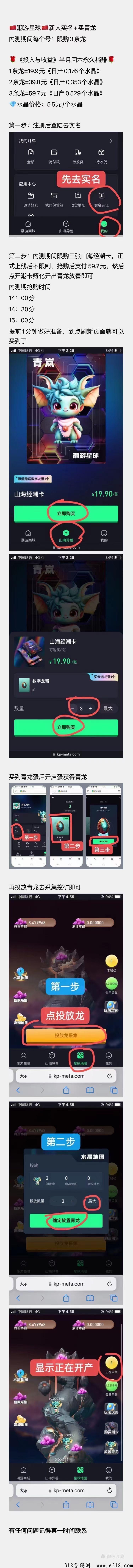 用户注册购买三张卡,一张卡19.9,成本59.7,可以得到三条龙把龙放置到水晶地图就可以采集水晶了,三条龙每天可以采集0.529个水晶,现在的水晶价格6一个供应不求,0.529×30×6=95.22半个月左右回本,接下来每个月躺赚,后期可以购6张卡最划算每天采集1.059个。