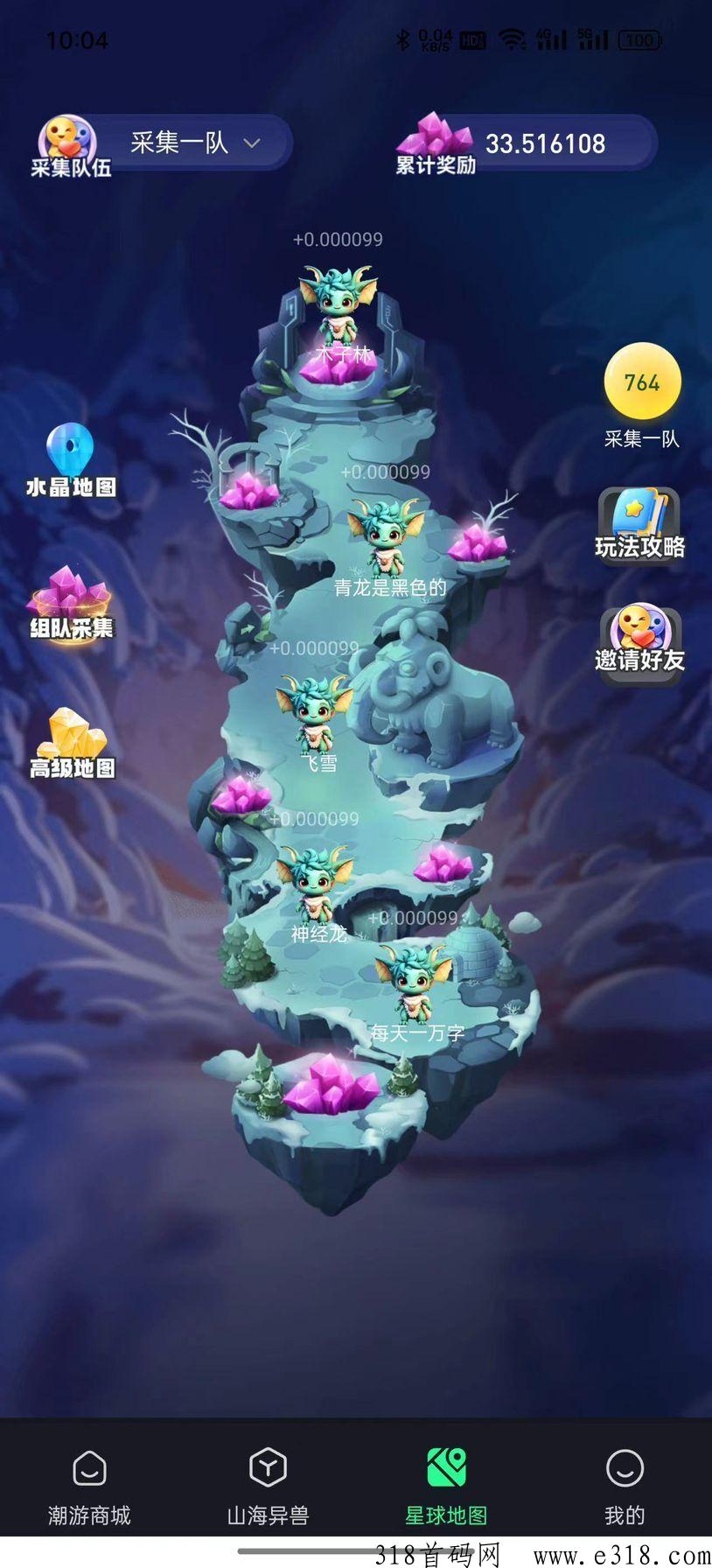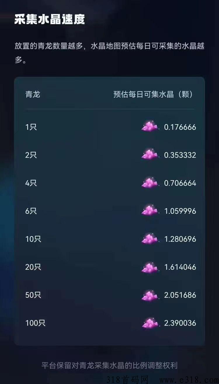 水晶地图是潮游星球水晶的采集地,你购买的青龙会自动采集水晶。青龙越多,采集水晶的速度越快。购买19.9元山海经潮卡后需要开蛋,然后手动放置青龙去采集地,然后就可以自动采集水晶了,不需要看广告什么的,一次购买永久**。