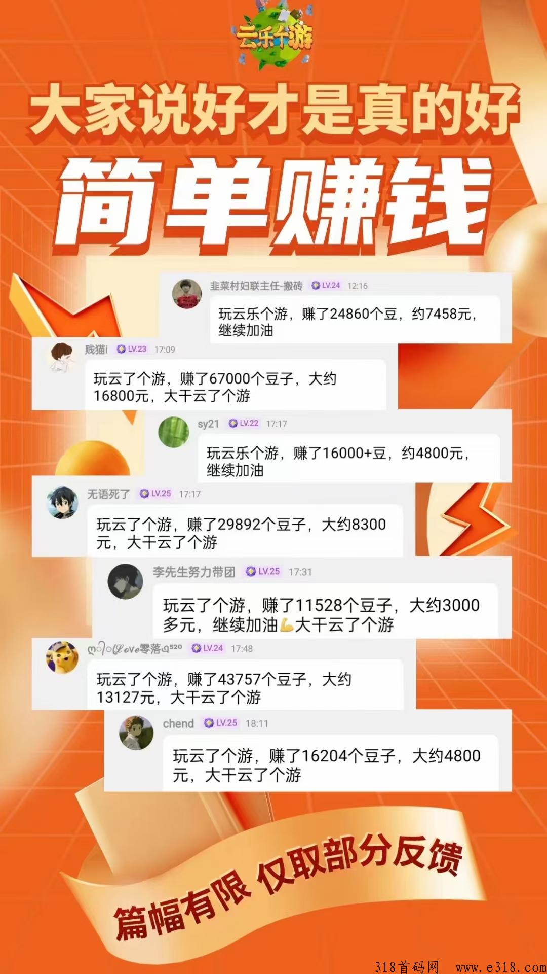 在云游,只要你有想法,有行动,赚米很轻松!不论是你是**投资老板,还是推广团队长,还是代理每天收出豆子搬砖,你只要你勇于付出,云游一定会给你一个满意的结果——公司实力兜底,代理顶商协作共赢!