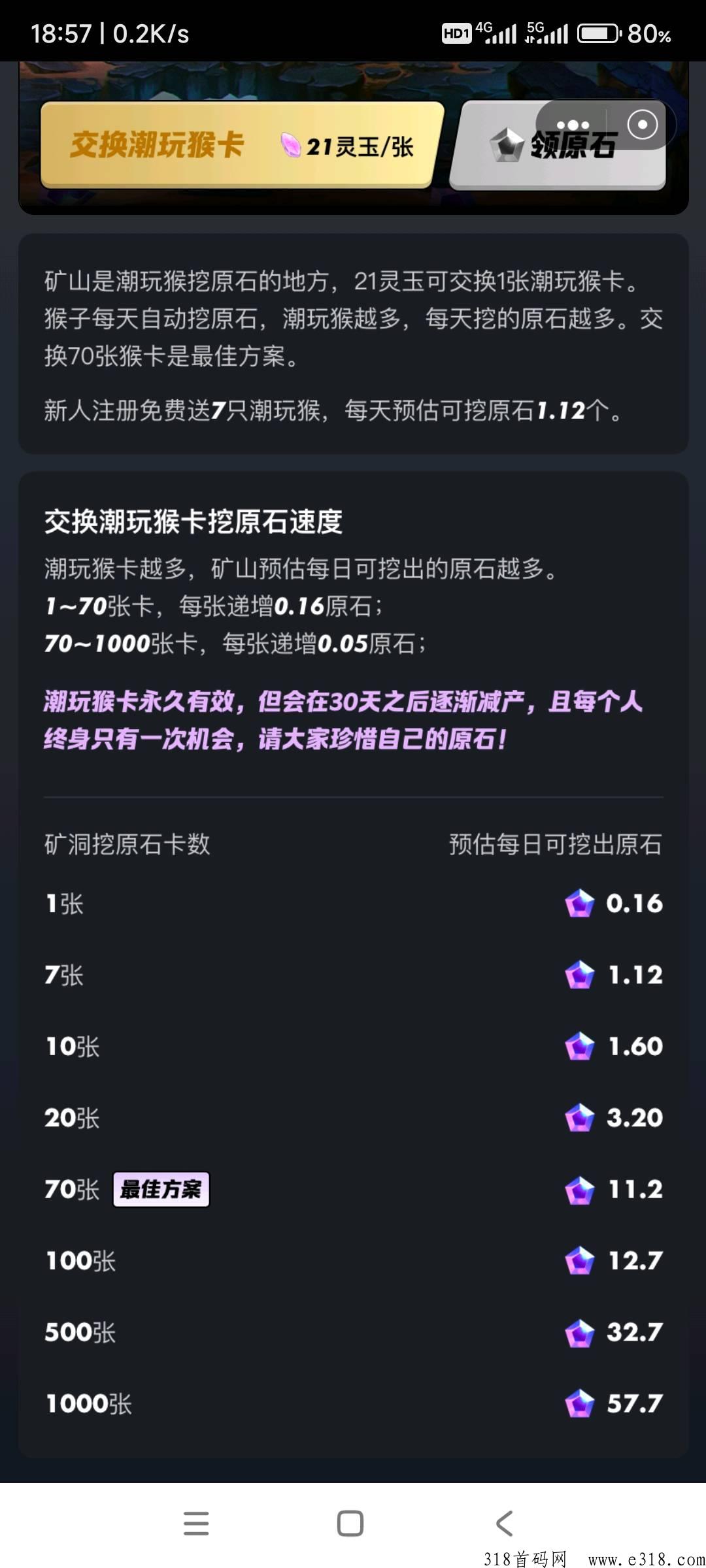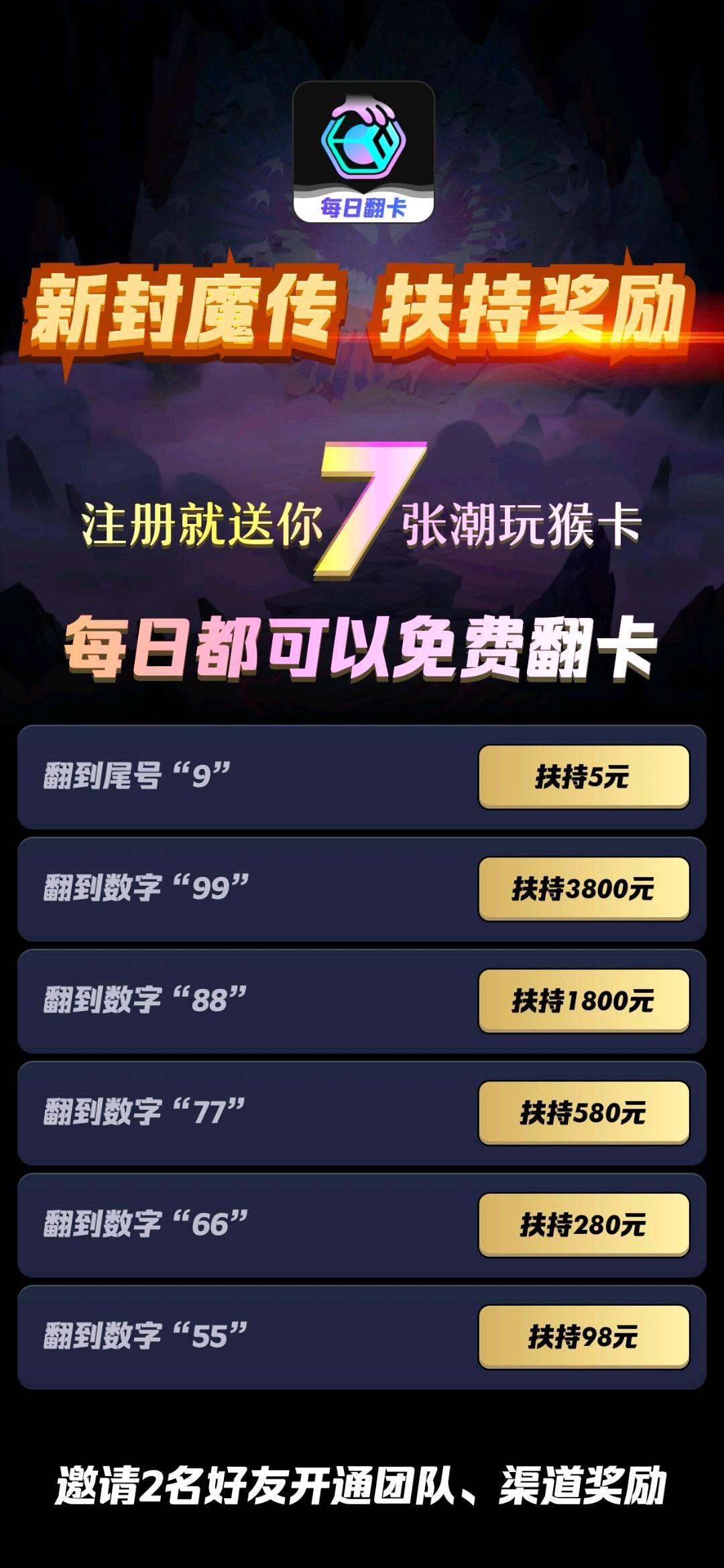注册就送7只潮玩猴每日挖原石平台所有积分可以互换互通郑重承诺不卖任何货币和卡片半年内要做到1000万注册做推广可以按这个表扶持