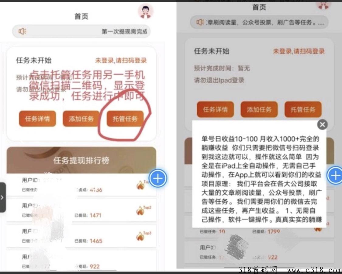 用另一部手机登录微信号扫码登录躺赚平台!一个躺赚账号托管一个微信号是实现利益最大化。进去躺赚主页点击托管任务→用一部手机登录微信扫码 同意后过几秒就登上了就不用管了平台会自己自动做任务!注意: 确保微信扫码页面显示:ipad 微信已登录即可!